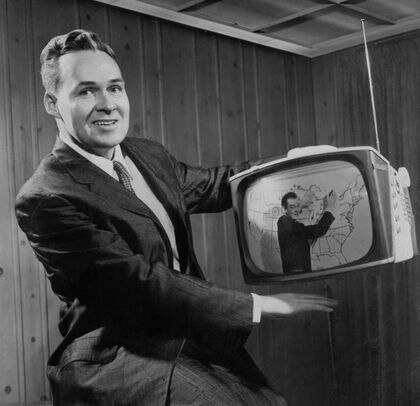 Robert Galvin with a portable television that used transistors.MOTOROLA